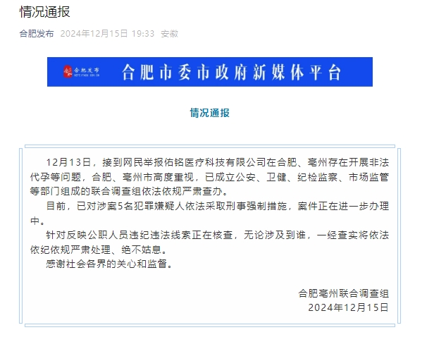 官方通报“合肥一公司开展非法代孕活动”:5人被采取刑事强制措施