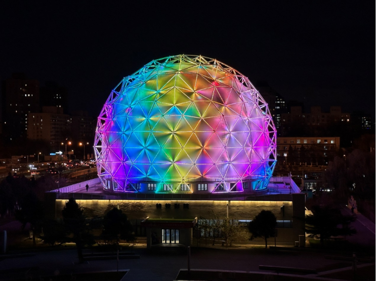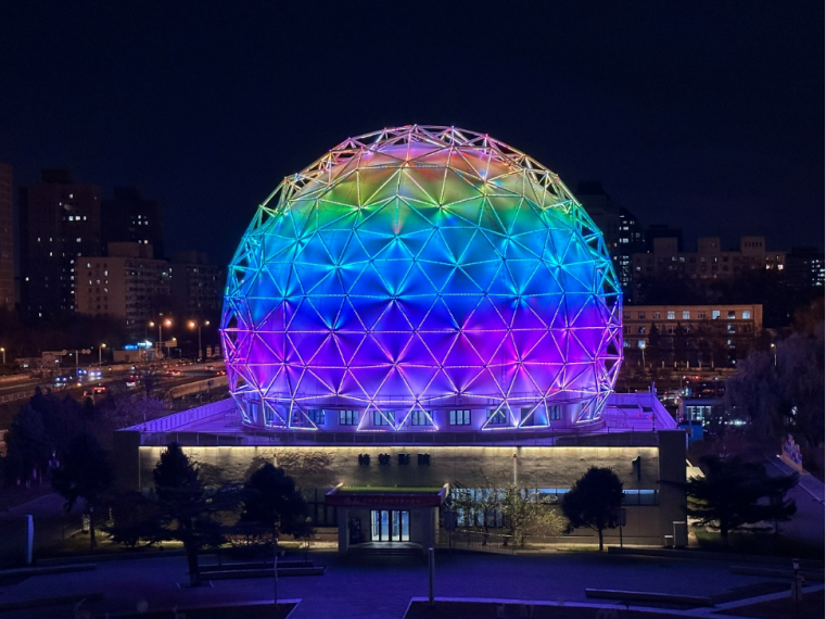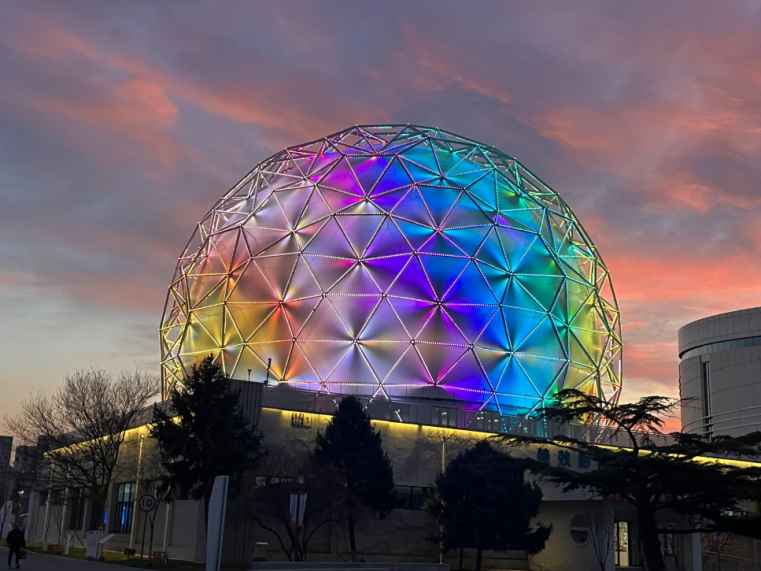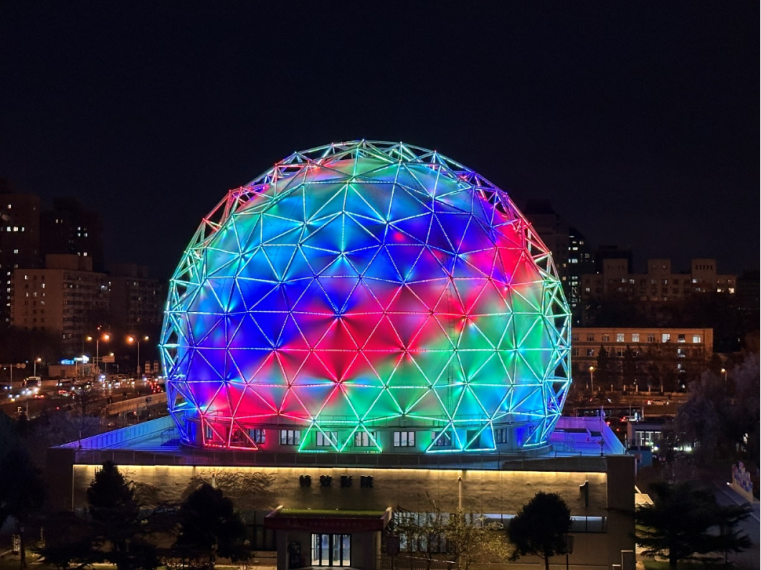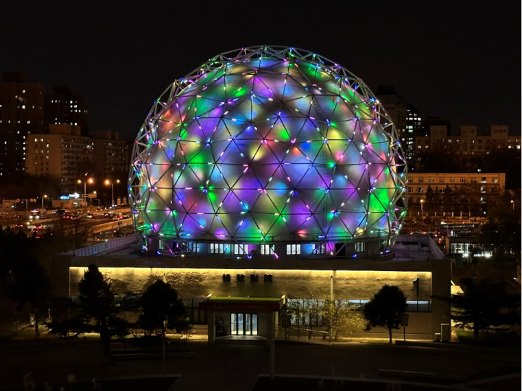 近期经过全面升级和灯光氛围营造,让原本白天可见的地标“圆球”,在夜晚也被点亮可见。