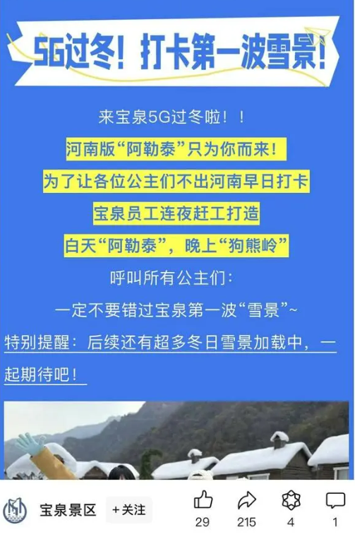 ▲宝泉景区官方微信公众号曾发布“河南版‘阿勒泰’”“5G过冬!打卡第一波雪景!”以及“一定不要错过宝泉第一波‘雪景’”等图文稿件,现已被删除。图/宝泉景区微信公众号