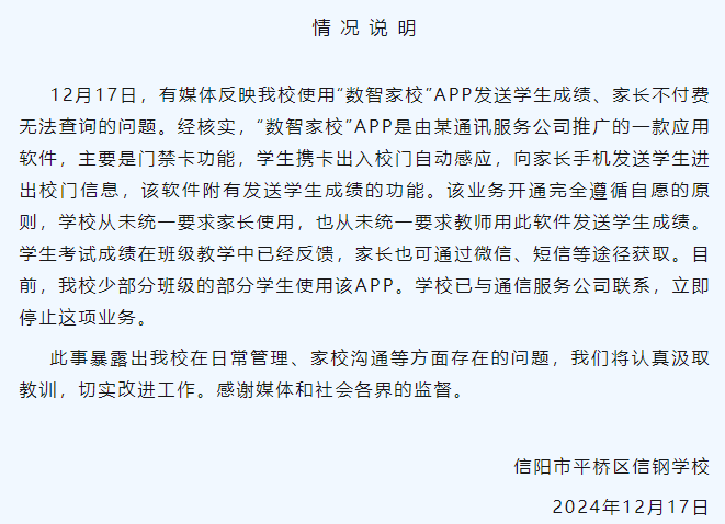 新京报讯 12月17日,信阳市平桥区信钢学校就媒体反映校方使用“数智家校”APP发送学生成绩、家长不付费无法查询的问题发布情况说明。全文如下: