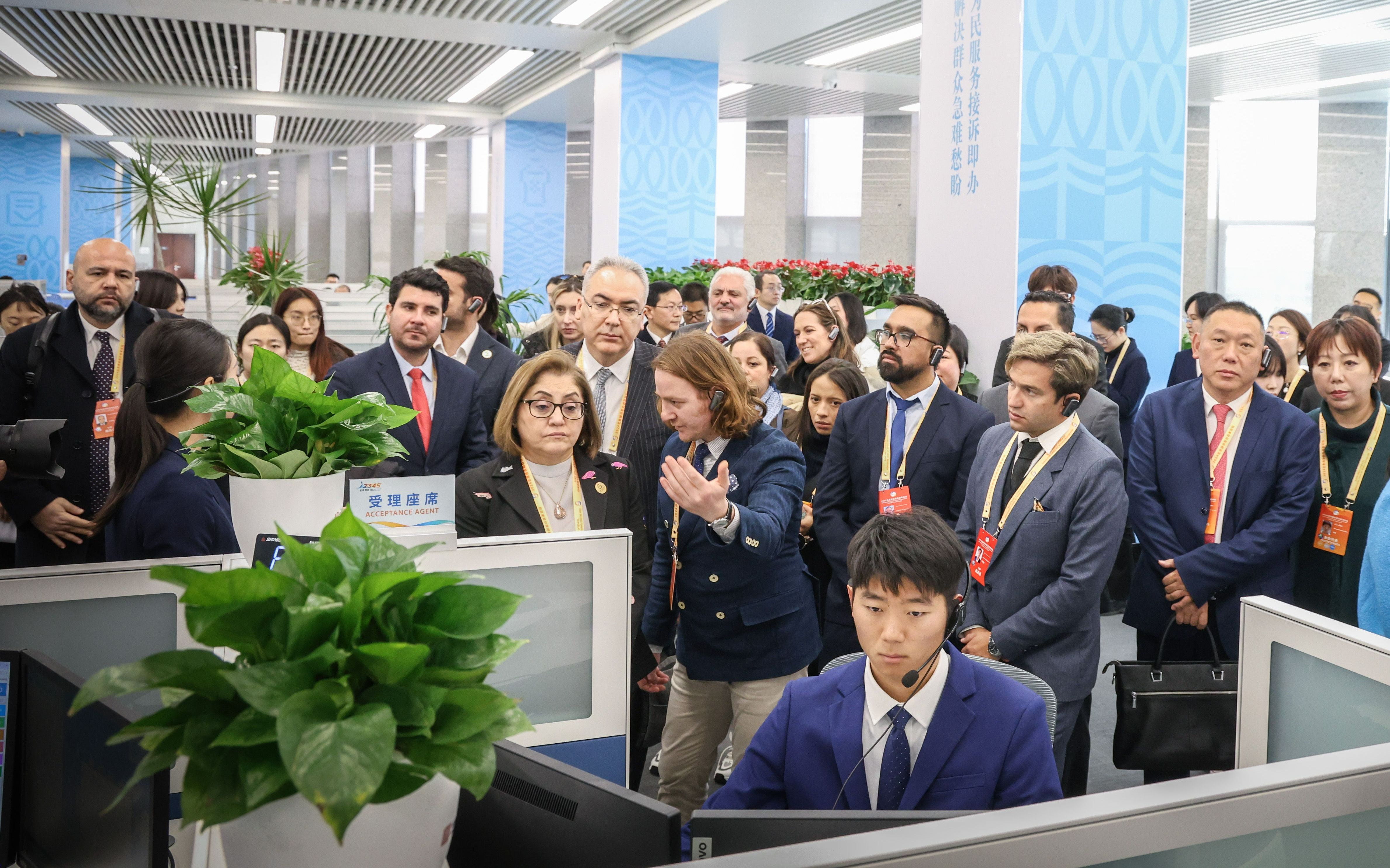 国际嘉宾走进北京12345市民热线服务中心。新京报记者 王远征 摄