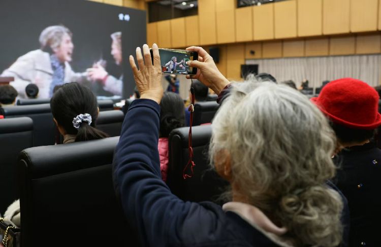 嘉宾观看表演艺术家朱琳的影像资料。朱琳是江苏连云港海州人,北京人民艺术剧院演员,被誉为 “中国话剧皇后”。她在《雷雨》《蔡文姬》等五十部经典话剧中塑造了众多光彩夺目的舞台形象,以深厚艺术造诣享誉国内外,荣获多项殊荣,是中国话剧表演艺术标杆人物之一。