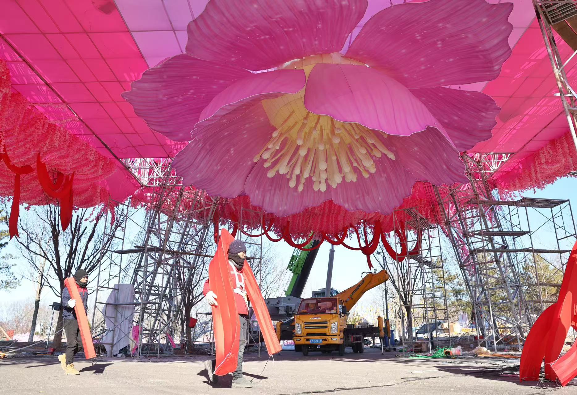 工作人员正在搭建景观。新京报记者 王飞 摄