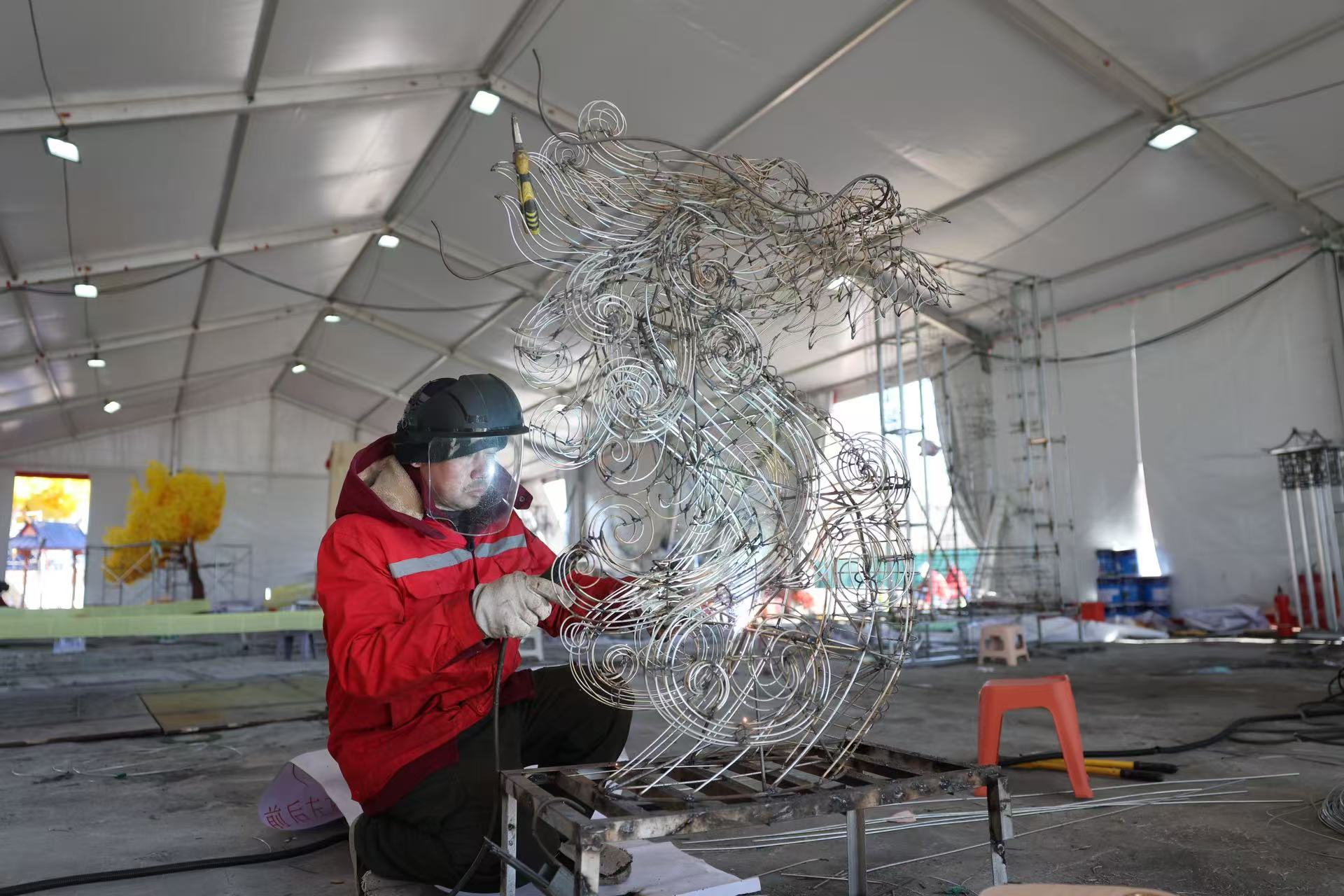 工作人员正在焊接龙首。新京报记者 王飞 摄