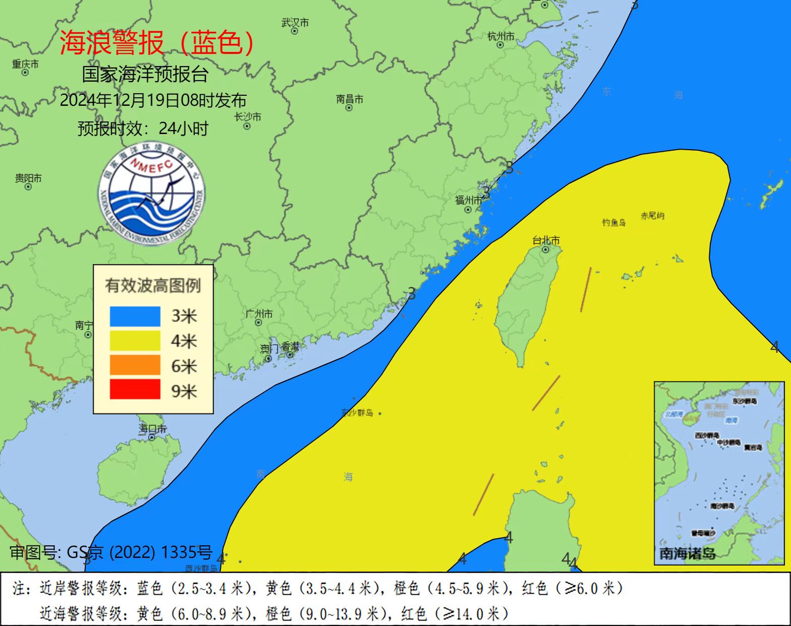 受冷空气的影响,预计12月19日中午到傍晚,东海南部、台湾海峡、南海东北部将出现3到5米的大浪到巨浪区;浙江南部、福建近岸海域将出现2到3米的中浪到大浪,近岸海域海浪预警级别为蓝色。预计19日夜间视情况解除海浪警报。国家海洋预报台提醒在上述海域作业的船只注意安全,沿海各有关单位提前采取防浪避浪措施。