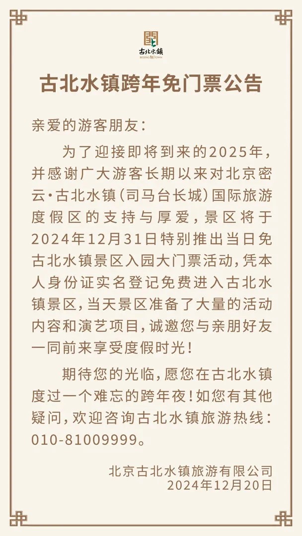 新京报讯 据“北京发布”微信公众号消息,古北水镇近日发布跨年免票公告称,景区12月31日将推出单日免入园大门票活动,游客凭身份证实名登记即可免费进入景区,景区准备了大量的活动内容和演艺项目。