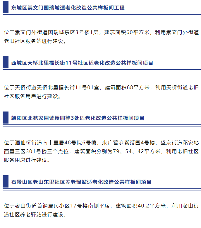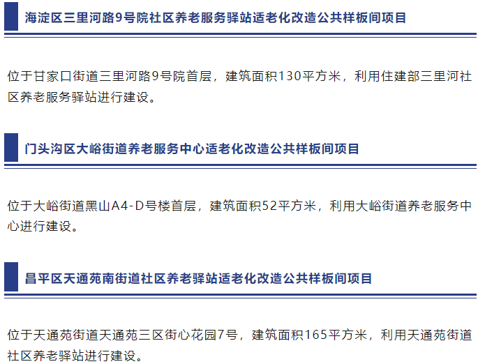 新京报讯 据北京市发改委消息,北京首批9个适老化改造公共样板间获批建设,将利用社区服务站等空间,建设一批具有复合体验的多功能公共样板间试点,方便老年人就近体验。