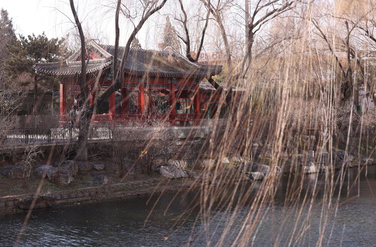 虽是冬日,但公园内的越冬植物依然绿意盎然,护城河流水潺潺。
