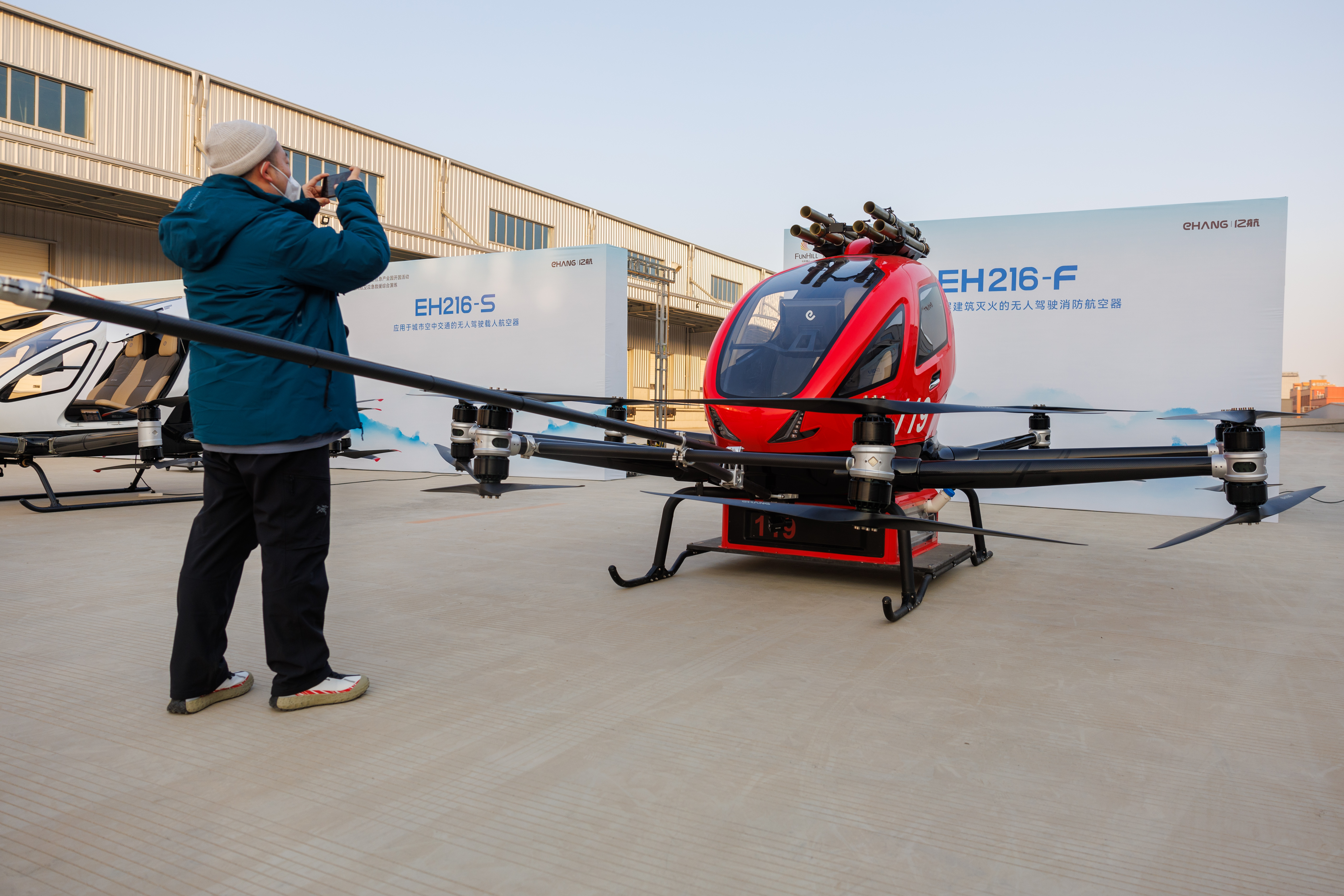 媒体记者拍摄无人驾驶消防航空器。新京报记者 王子诚 摄