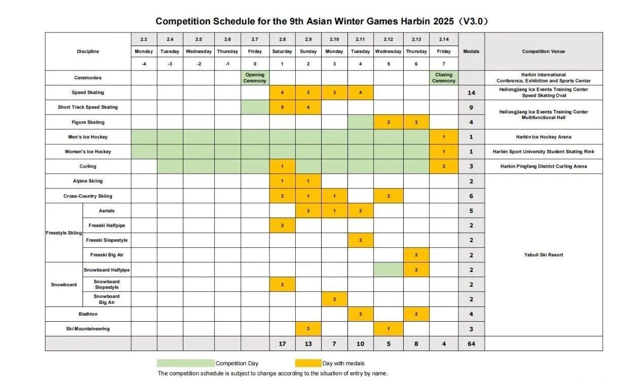2025年第九届亚冬会竞赛总日程(3.0版)正式发布