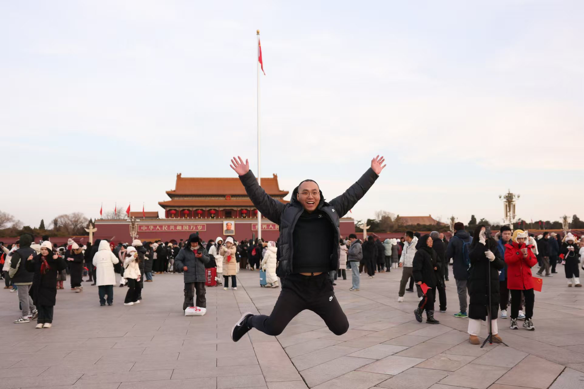 一名游客在天安门广场高高跃起拍照。
