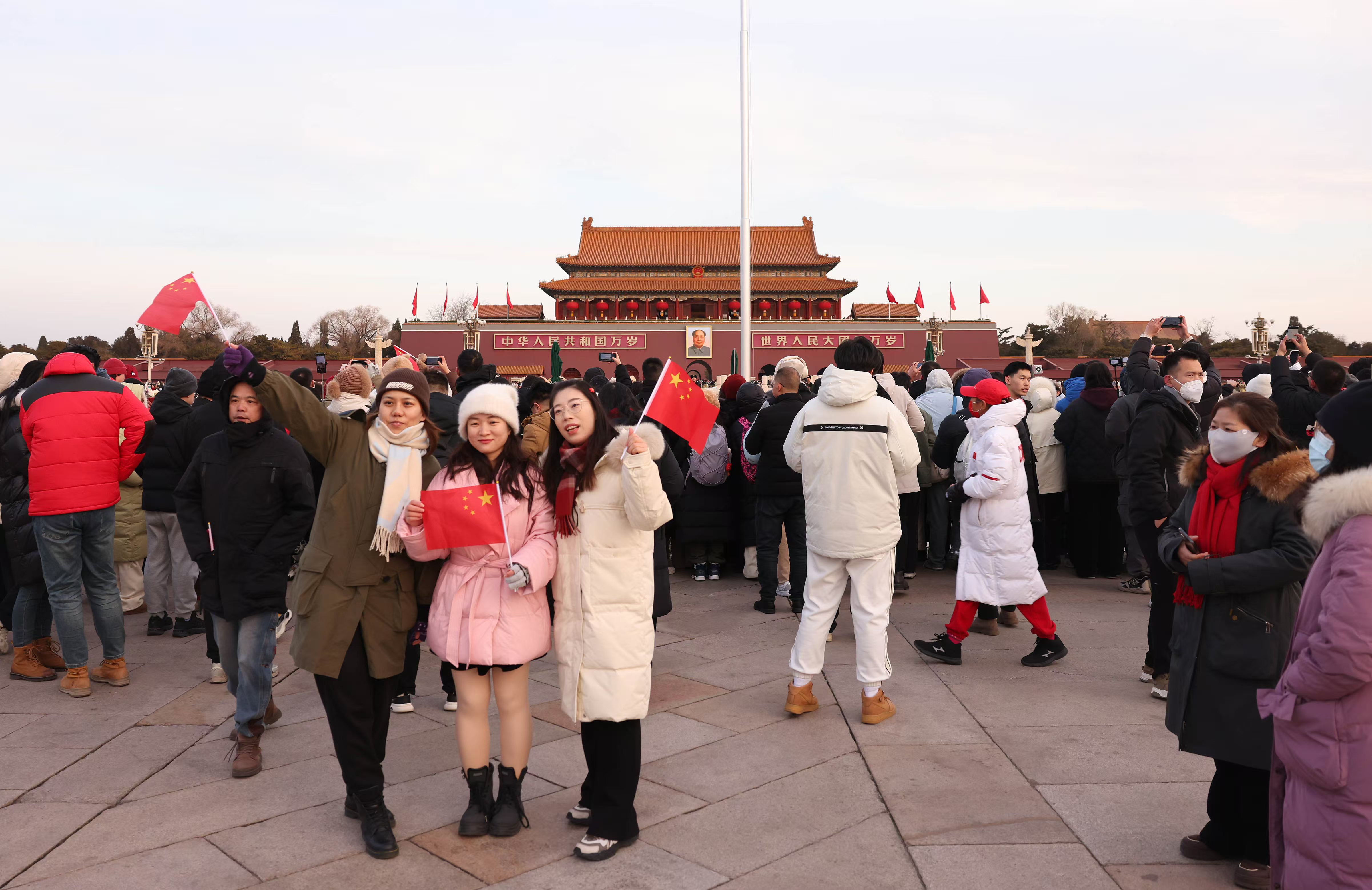 1月1日清晨,5万多名来自五湖四海的游客来到天安门广场,共同迎接元旦的到来。