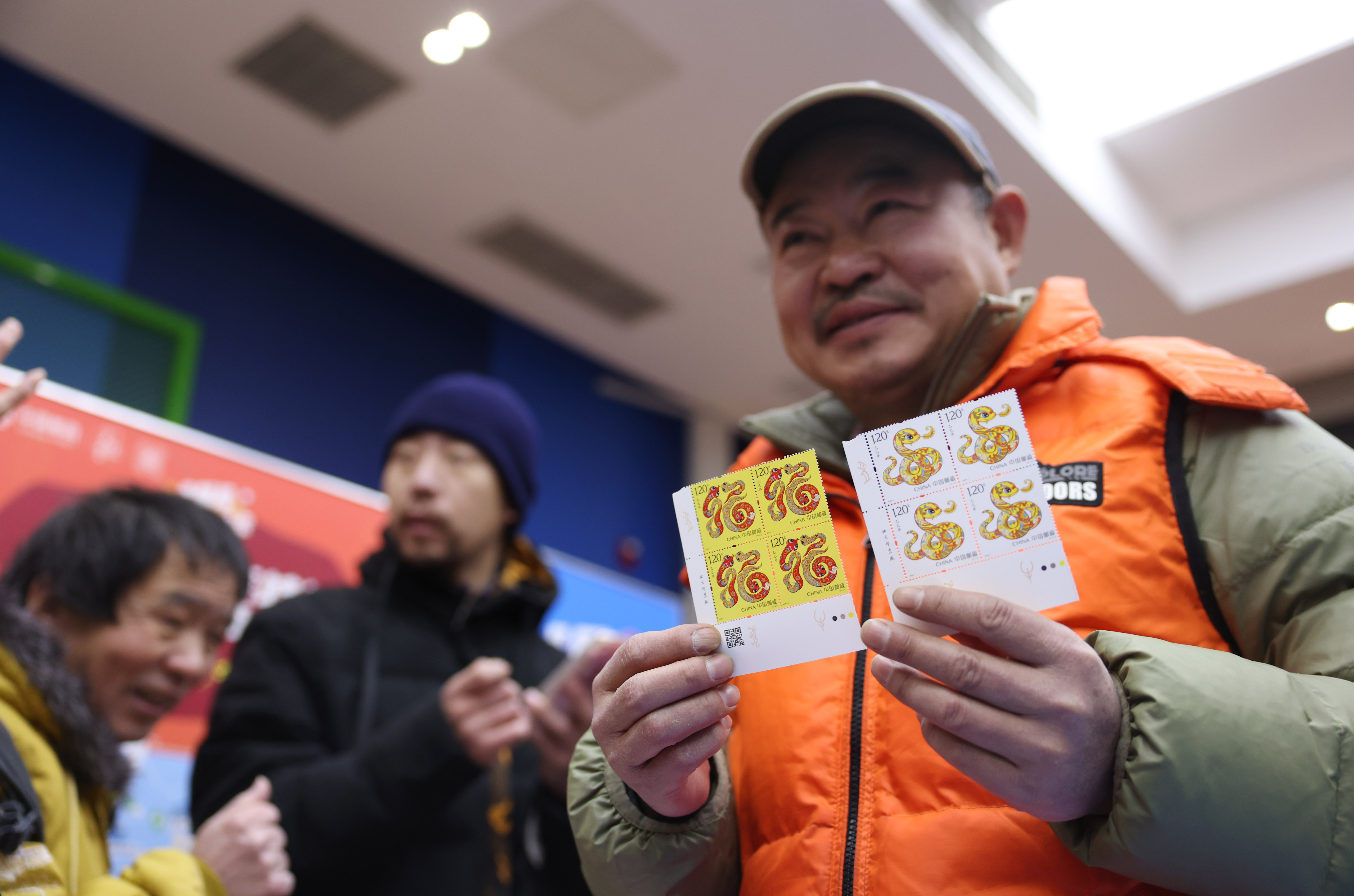 一名集邮迷在展示刚刚购买的《乙巳年》特种邮票。新京报记者 李木易 摄