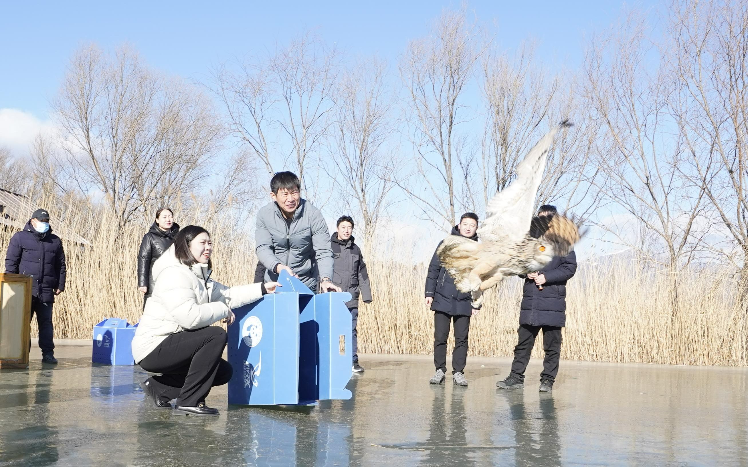 活动当天,五只被救助的灰鹤、大鵟(kuáng)等野生鸟类在佩戴环志、卫星定位监测设备后,于野鸭湖自然保护区放飞。