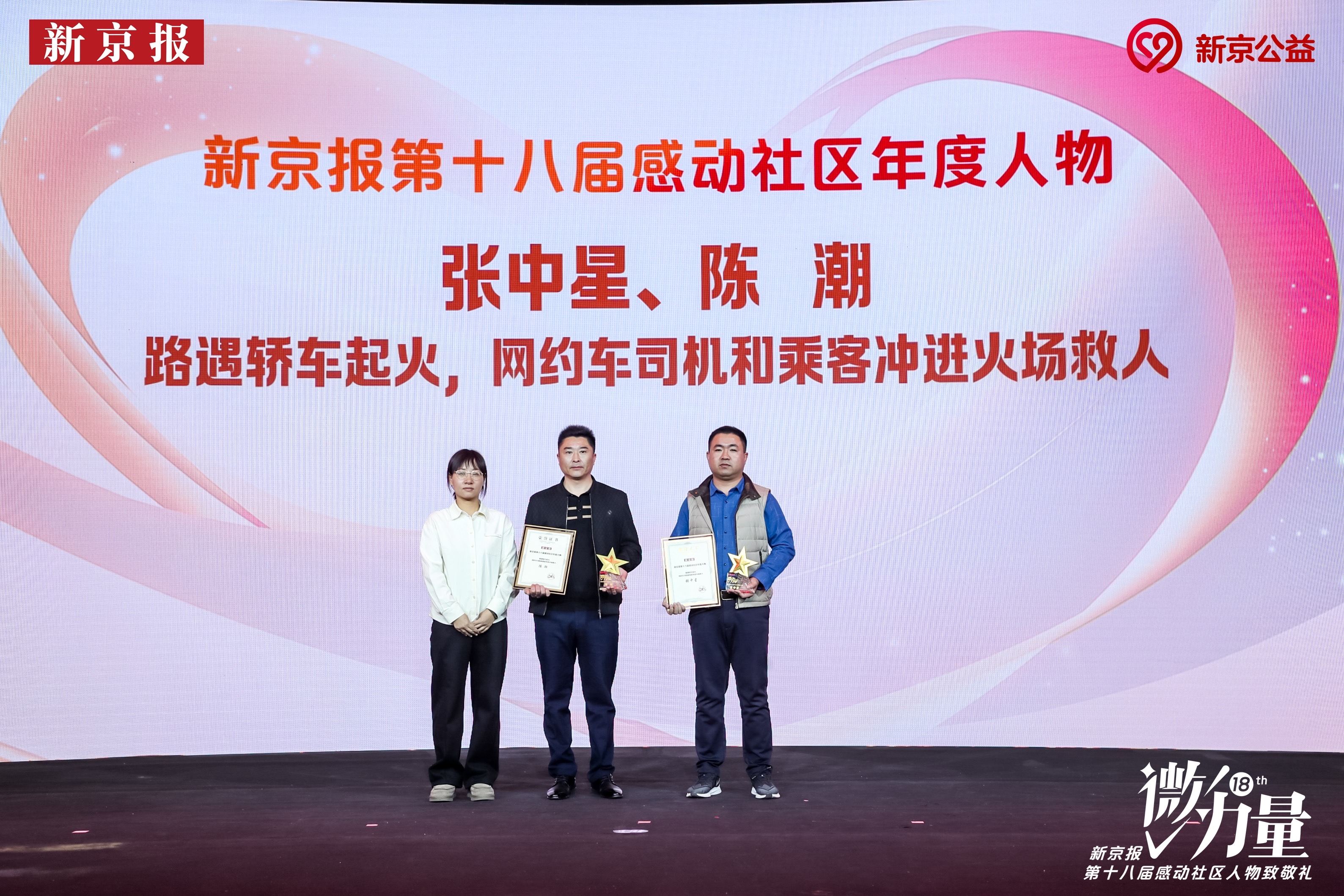 新京报讯(记者左琳 彭镜陶)1月7日,在“微力量·新京报第十八届感动社区人物”致敬礼上,曾冲进火场救人的网约车司机张中星及乘客陈潮,获评“感动社区年度人物”。