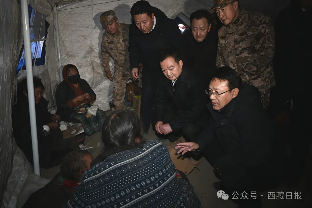 每到一处,王君正都向群众转达习近平总书记和党中央、中央领导同志的关心关怀,告诉群众相信有习近平总书记的关心关怀,我们就没有克服不了的困难。当受灾群众听到习近平总书记和中央领导同志的关心关怀,大家十分激动,许多群众流下了感动的泪水,对抗震救灾、重建家园燃起了信心。“我们就是担心老人孩子晚上受冻感冒。”当听到灾区群众的担心时,王君正说:“你们的担心正是我们的担心。”天灾无情、人有情。在安置点上,王君正鼓励受灾群众坚定信心,党和政府一定会全力以赴开展抗震救灾,大家要团结一心、互帮互助,克服暂时的困难,加强统一规划、重建新家园,齐心协力共建社会主义新农村。晚上六点三十分许,海拔4400米的安置点上寒风凛冽,看见已有帐篷陆陆续续搭建起来,王君正叮嘱受灾群众赶紧到帐篷里取暖,不要受凉受冻。他要求相关部门,要深刻认识灾区地处高海拔区域的特殊情况,把受灾群众御寒保暖工作摆在更加突出位置,加紧调集棉帐篷、棉衣、棉被、烤火炉等物资,加快帐篷安装进度,确保受灾群众吃上热饭、喝上热水、住上帐篷、温暖过夜、感受亲情。要严防发生次生灾害,全面排查房屋受损情况,对严重受损的建筑严格管控,强化巡查值守,做好安全防范工作,严防火灾,抓好卫生防疫,配备预防流感等药物,加强食品和饮用水卫生监管,坚决维护灾区社会稳定。要充分发挥基层党组织战斗堡垒作用和党员先锋模范作用,落实落细党中央和自治区抗震救灾各项安排部署,主动同受灾群众吃住在一起,用心用情解决困难,引导受灾群众开展自救、互帮互助,让党旗在抗震救灾一线高高飘扬。党政军警民要协调联动,解放军、武警、消防、边检和地方各救援力量要统一指挥、统一调度、加强协同、密切合作,齐心协力抓好抗震救灾工作。
