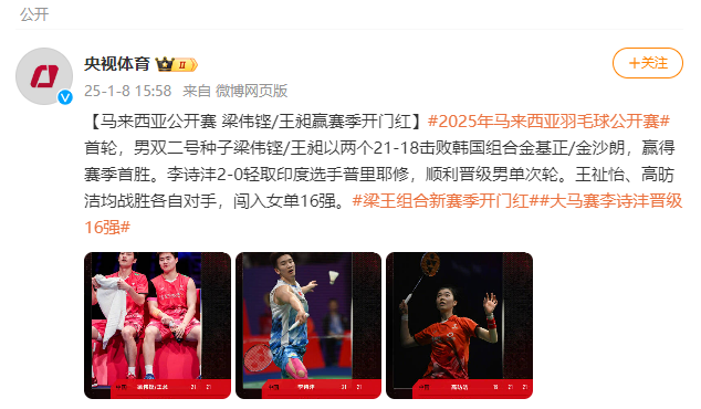 据@央视体育 消息,2025年马来西亚羽毛球公开赛首轮,男双二号种子梁伟铿/王昶以两个21-18击败韩国组合金基正/金沙朗,赢得赛季首胜。李诗沣2-0轻取印度选手普里耶修,顺利晋级男单次轮。王祉怡、高昉洁均战胜各自对手,闯入女单16强。