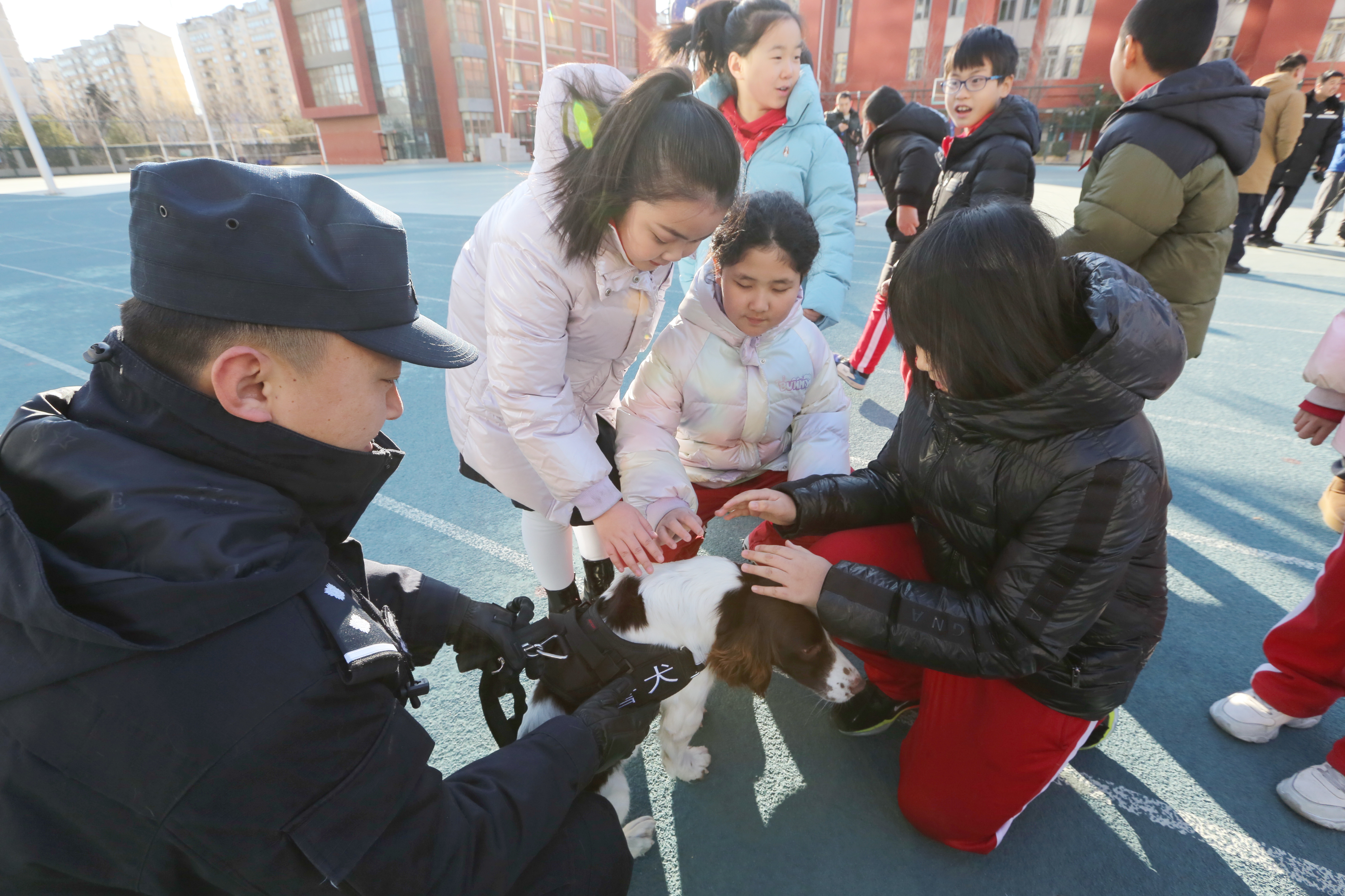 活动室外现场,学生们和警犬互动。 图源:通州警方