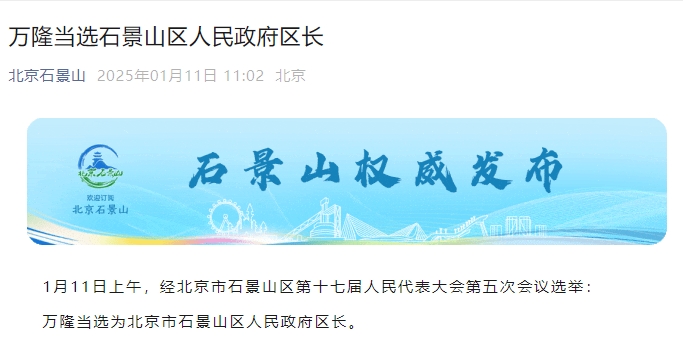 新京报讯 据北京石景山微信公众号消息,1月11日上午,经北京市石景山区第十七届人民代表大会第五次会议选举: