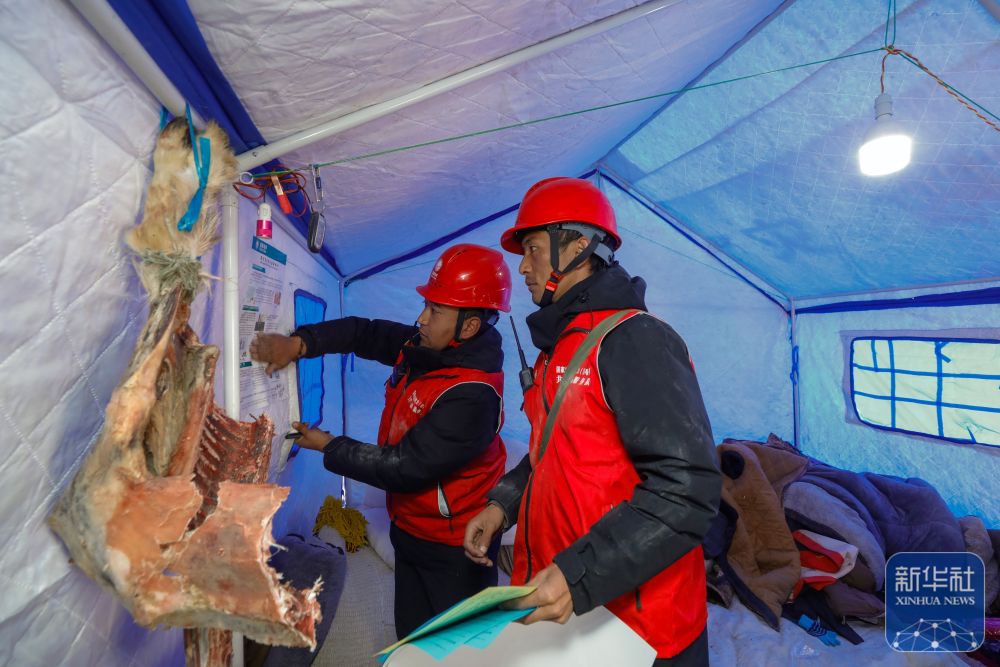 1月11日,在定日县措果乡塘仁村,国家电网日喀则供电公司的工作人员检查安置点的临时线路。新华社记者 沈伯韩 摄