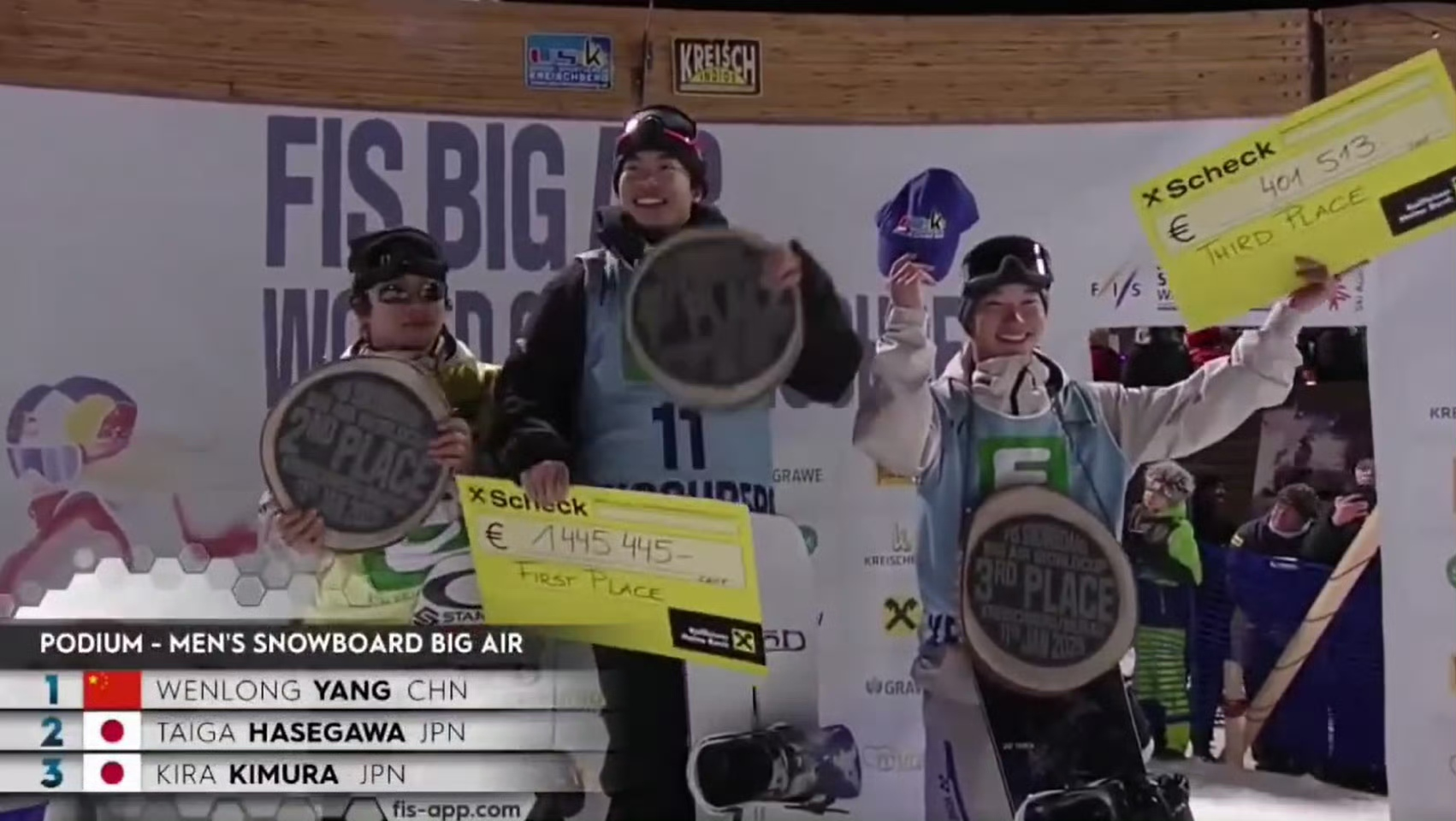 杨文龙首夺单板滑雪大跳台世界杯冠军 苏翊鸣第九
