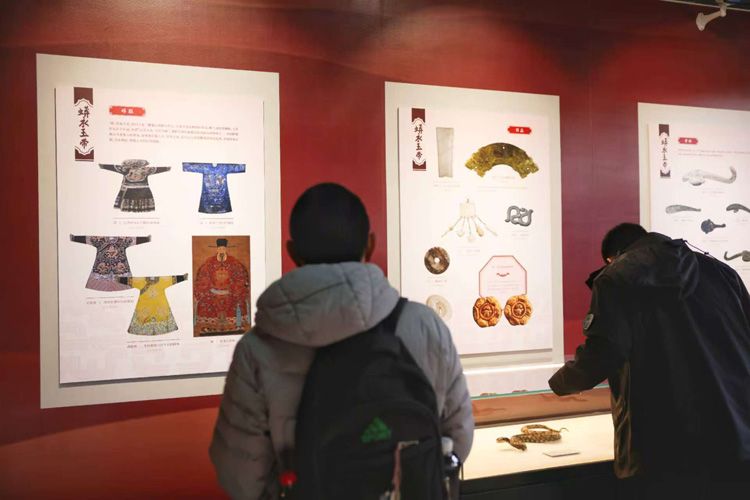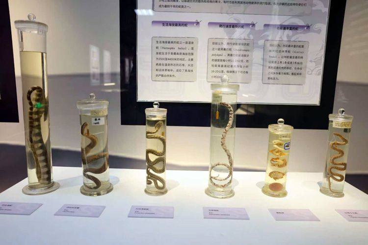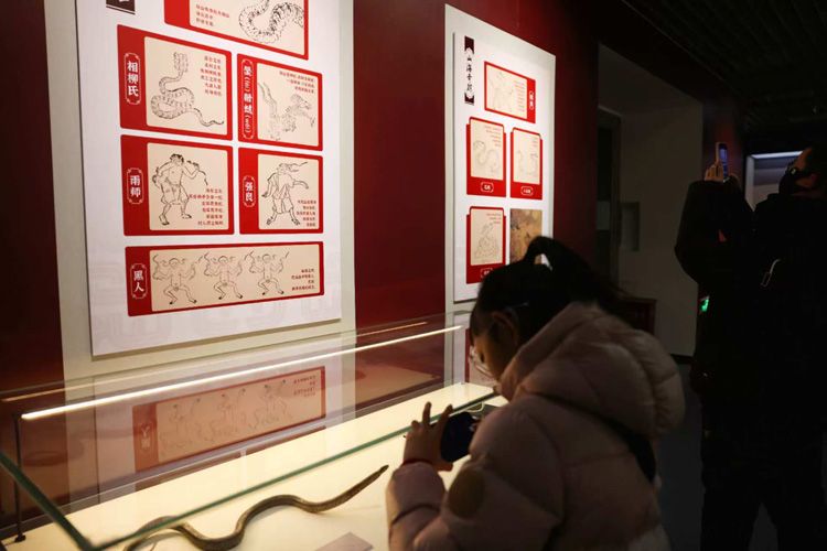本次展览划为四个单元,分别是 “生肖文化的源与流”“腾蛇乘雾”“幽幽蛇影” 以及 “蛇舞丰年”。以中国传统配色划分不同单元主题,同时融入大量蛇相关设计元素,与蛇类标本相呼应。图为观众参观蛇标本,墙上展示《山海经》古籍中各种蛇的形象。