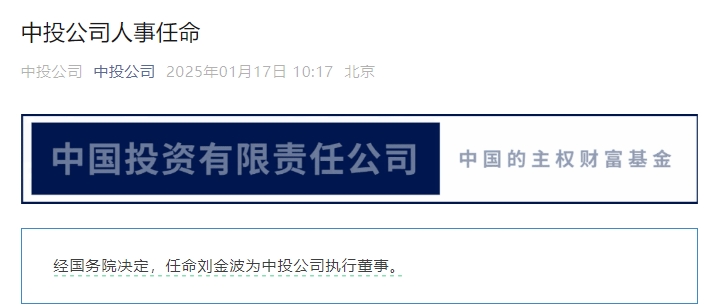 新京报讯 据中投公司微信公众号消息,经国务院决定,任命刘金波为中投公司执行董事。