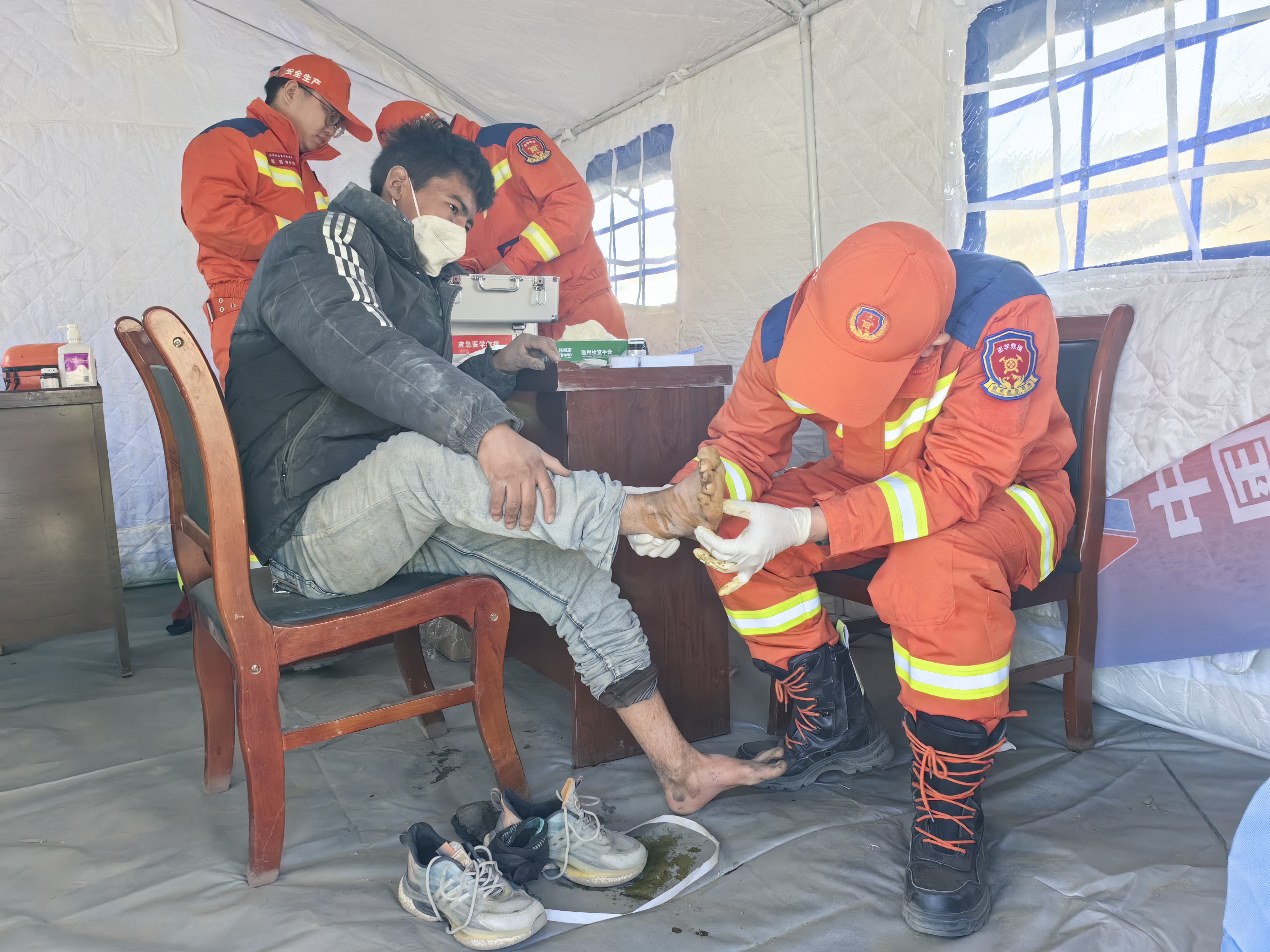 紧接着,他们在安置点开展巡诊,给群众测心率、量血压,查看伤口,发现有灾区群众此前被砸伤、擦伤,因当地气温过低,伤口不易愈合,甚至出现了轻微感染的症状,应急医学救援队队员赶紧清洁其伤口并处置。第一轮巡诊结束后,安置点的群众知道了医疗点的位置,陆续到医疗点拿药。