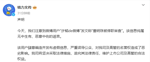 新京报讯 1月18日,@格力文传微博发布声明:今天,我们注意到微博用户“许韬de微博”发文称“董明珠被停职审查”。该信息纯属无中生有、恶意中伤的谣言。