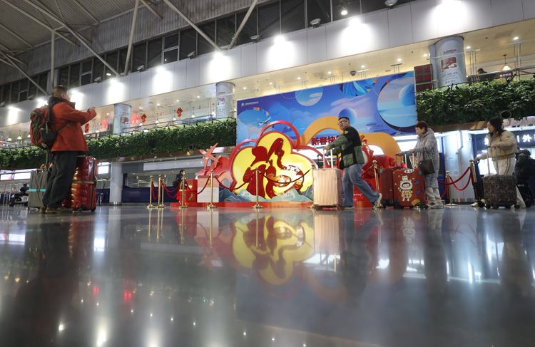 首都机场T2航站楼内打造了多处主题景观,旅客在春节景观前留影。