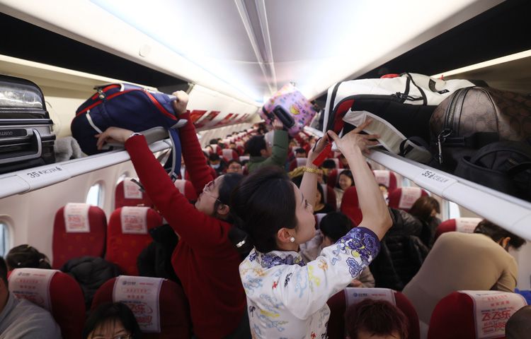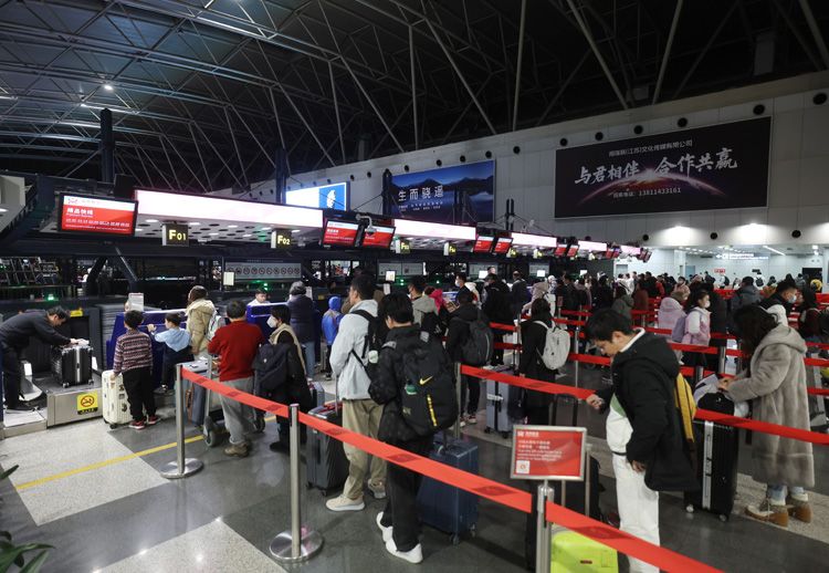 旅客排队托运行李。首都机场提醒旅客,春运期间尽早抵达机场,预留充足时间,并提前了解航班截载时间和乘机过检规定,避免携带违禁品和危险品。液态特色产品禁止随身携带,但可托运。
