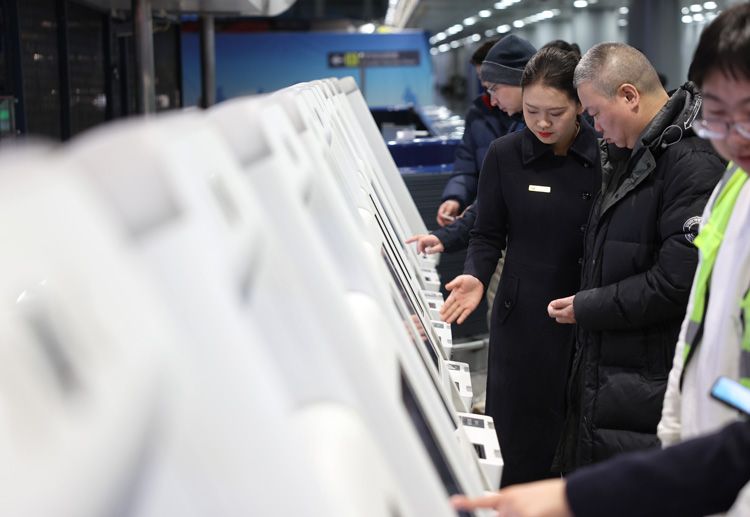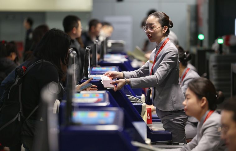 1月20日,首都机场T2航站楼,工作人员在柜台前端指引旅客。