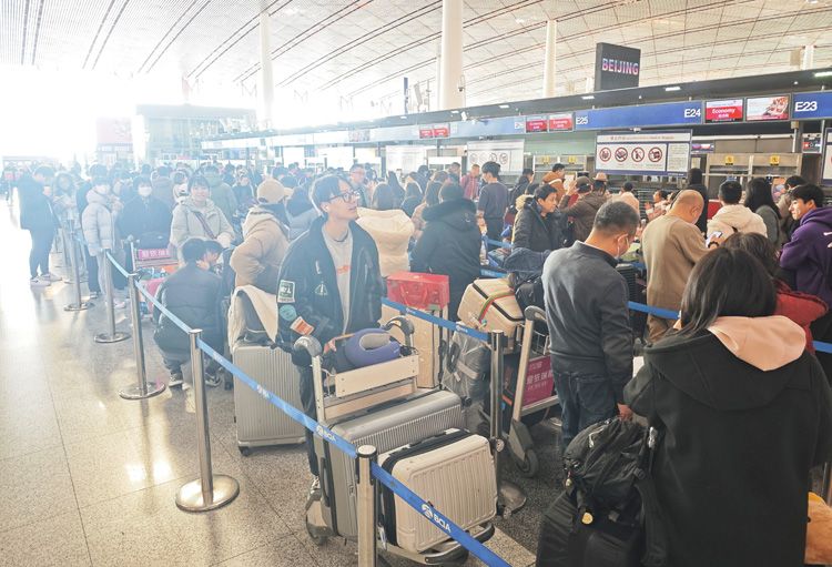 随着2025年春运的全面展开,首都机场迎来了客流高峰。1月20日,首都机场计划起降航班1256架次,其中进港航班628架次,出港航班628架次,预计旅客人数达19.98万人次。图为旅客排队办理值机手续。