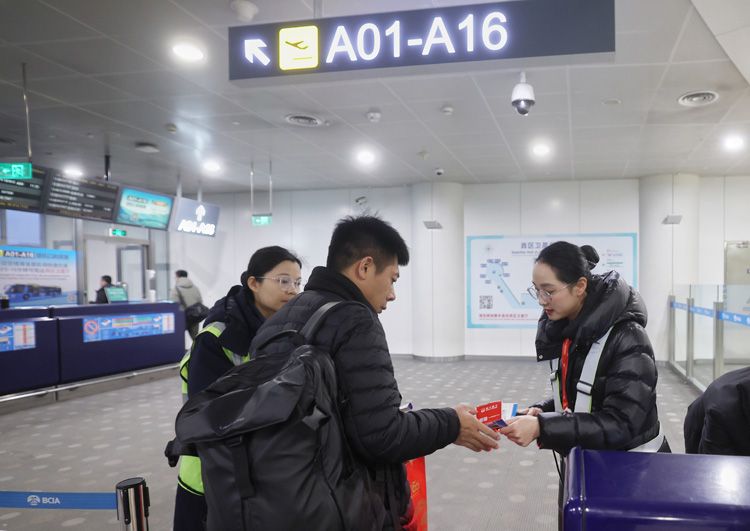 旅客在柜台办理托运手续。首都机场相关负责人表示,将全力以赴保障春运期间的航班运行和旅客出行,为旅客提供安全、便捷、温馨的服务。