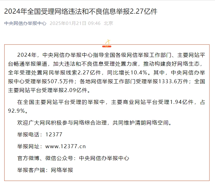 2024年全国受理网络违法和不良信息举报2.27亿件