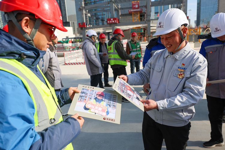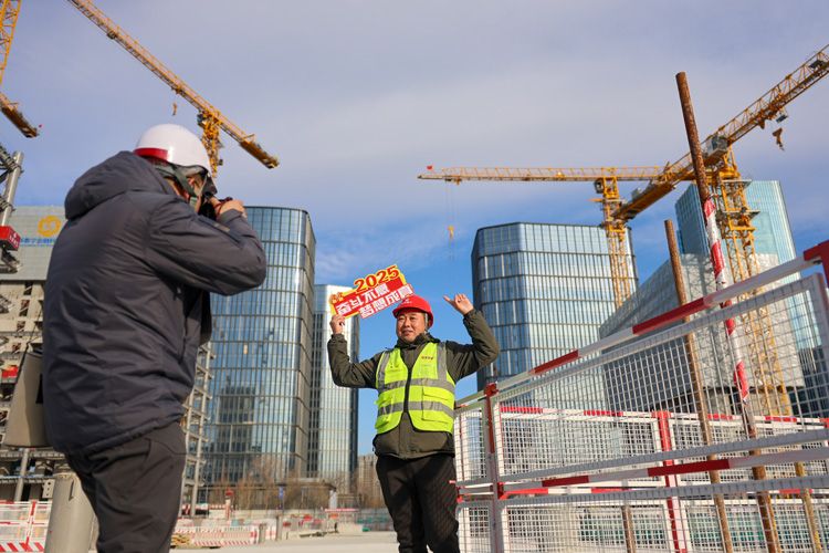 摄影师为工人拍摄照片。北京建工丽泽数字金融科技示范园项目是北京市目前在施工程中塔吊数量最多的工地,项目团队和1500余名建设者共同努力,于2024年12月2日全部完成地下结构施工,目前正在进行地上主体钢结构施工。该项目是北京市 2024年 “3 个 100” 重点工程及丰台区重点工程,是丽泽商务区一体化建设重要部分,总建筑面积49.7万平方米,由9栋单体建筑组成,建成后将成为现代化金融中心,助力丽泽金融商务区发展。