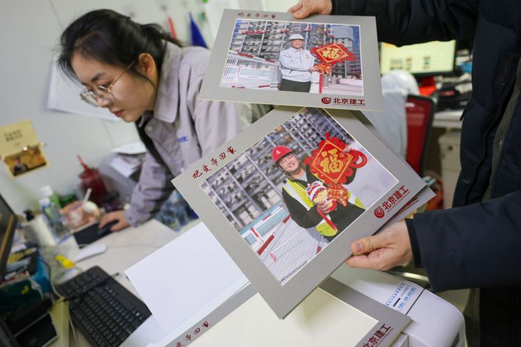 1月21日上午,临近小年,北京建工丽泽数字金融科技示范园项目邀请专业摄影师为一线建设者拍摄“工地写真”,装裱后让工友们带着祝福返乡。