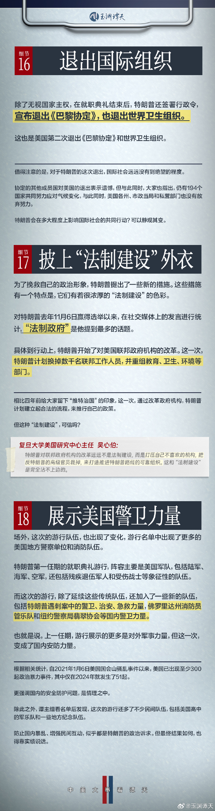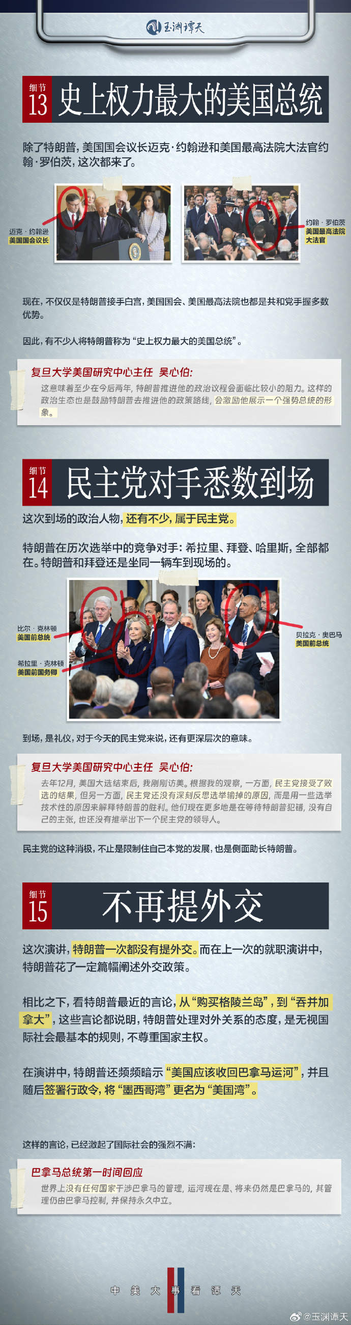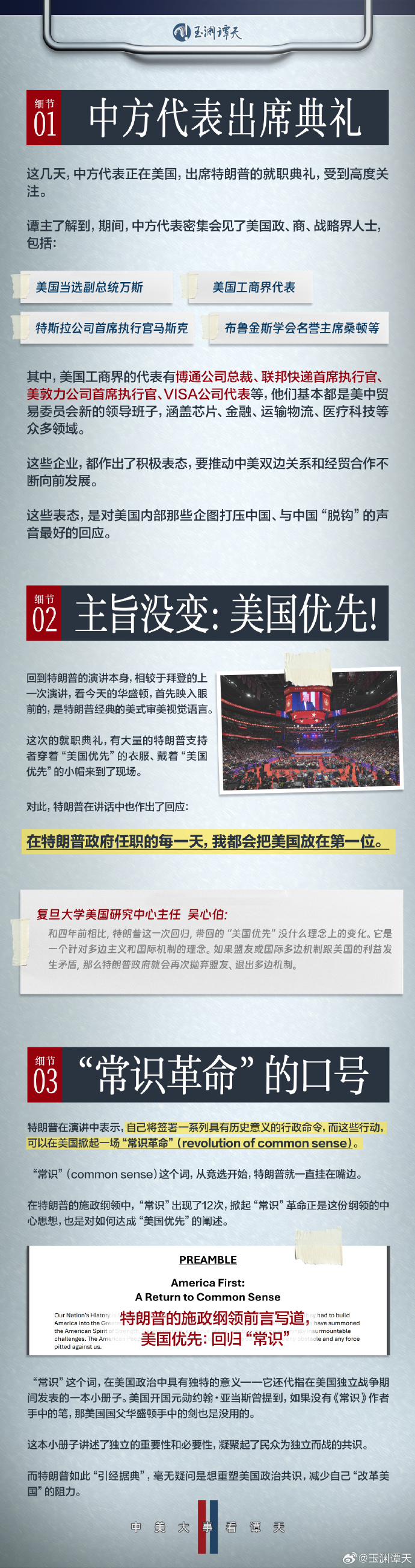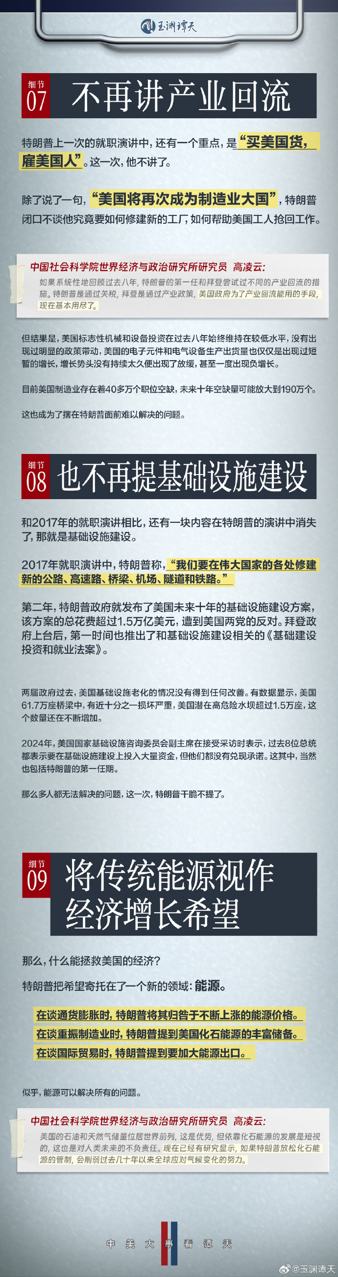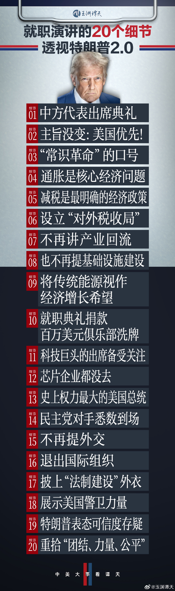 据玉渊谭天消息,当地时间1月20日,特朗普正式宣誓就任美国第47任总统,并发表了时长约30分钟的就职演讲。通过演讲和就职现场细节,我们得以透视“特朗普2.0”的政策走向与思路。