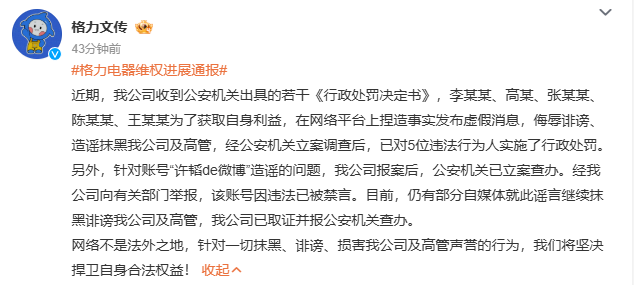 格力电器:5位造谣者已被公安行政处罚,造谣账号已被禁言