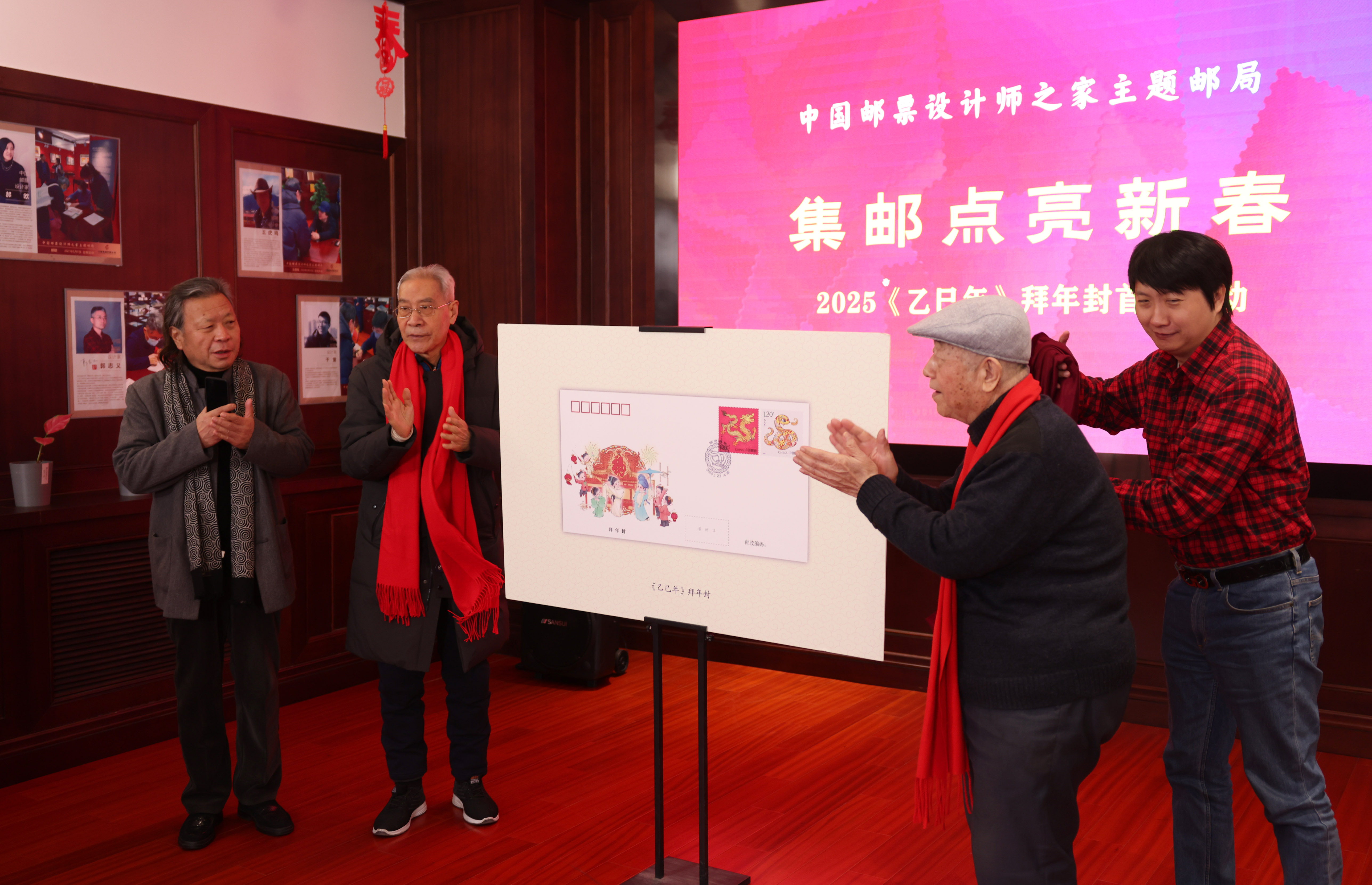 拜年封发布当日,著名邮票设计家阎炳武与张旺一起揭幕《蛇舞元宇》邮票珍藏套装,两位设计师还为现场的集邮迷们签名留念。