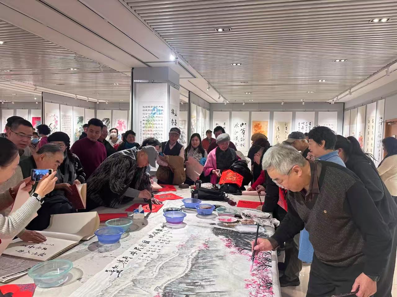 迎春艺术展开幕式后,多位书画家在名家笔会现场挥毫泼墨,合作水墨画卷“山舞银蛇”。东城区图书馆供图