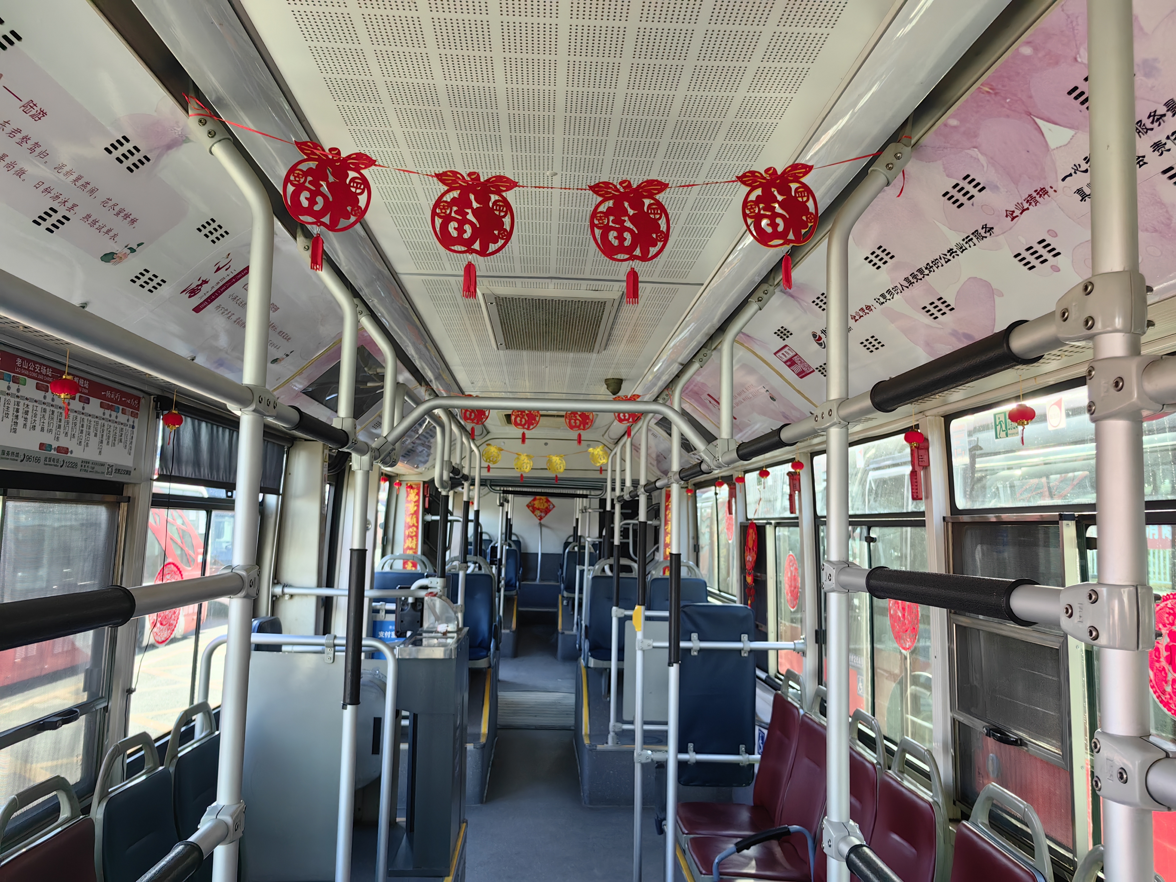 许多公交车厢内都挂起了红灯笼,车窗上还用“福”字窗花点缀,车载电视中滚动播放着“祝广大乘客新春愉快!”