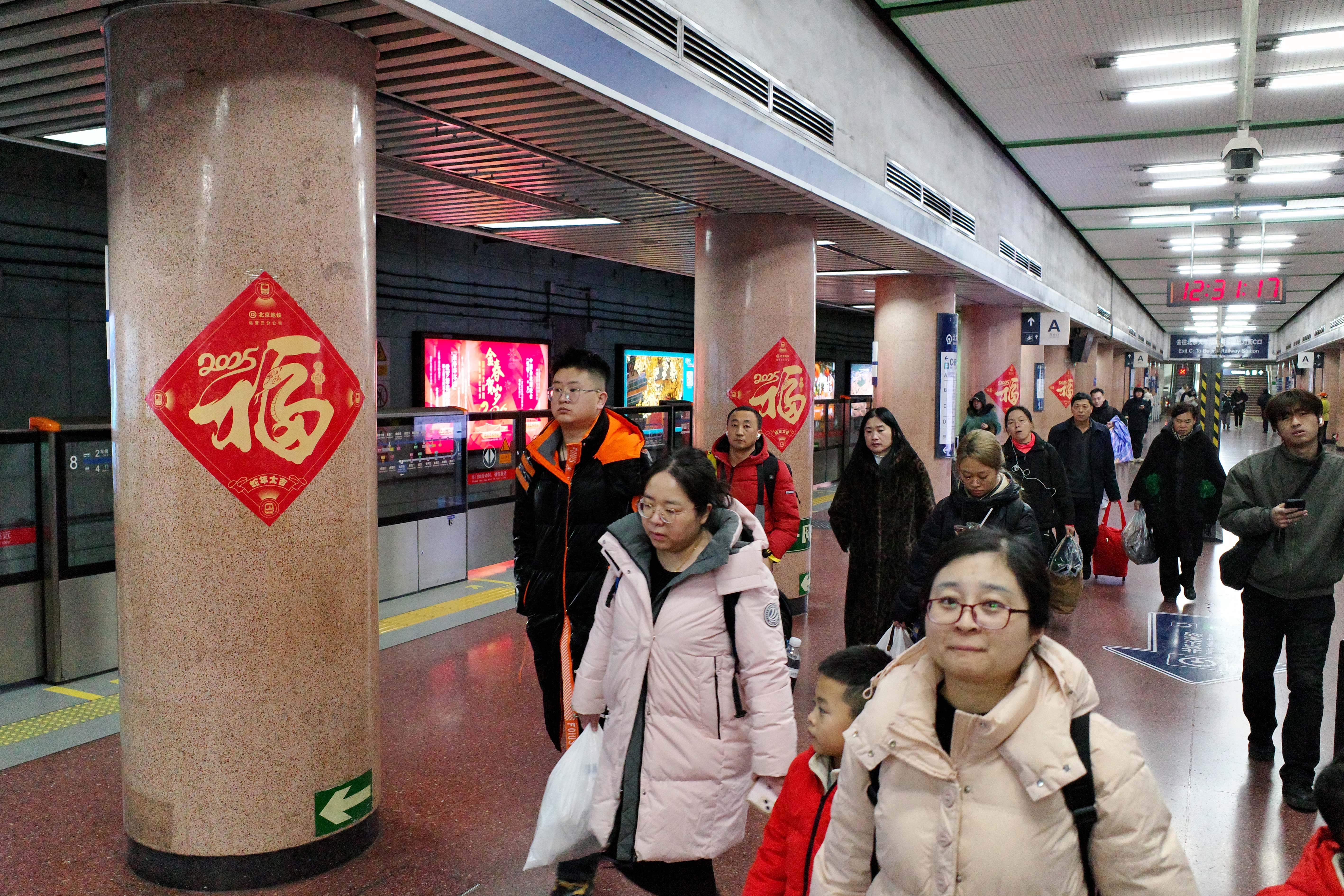 “蛇行华夏家家好,春至神州处处新”,在北京地铁5号线崇文门站,一副粘贴在站台屏蔽门上的春联吸引了不少乘客的关注,其实,不只是春联,在北京很多地铁站内还悬挂了大红灯笼,贴上了福字。在地铁2号线北京站,拉着行李箱的乘客不断走出车厢,车站内人头攒动,站台内的立柱上也贴满了福字,年味浓郁。