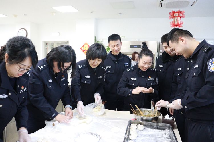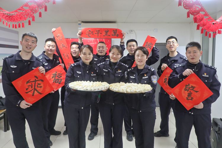警营里贴福字、挂灯笼,装饰一新,充满了喜庆氛围,民警们一起动手包饺子。