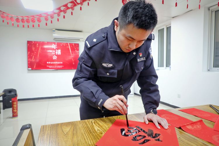 执法办案队和综合指挥室的民警们挥毫泼墨写“福”字,为同事送上新春祝福。