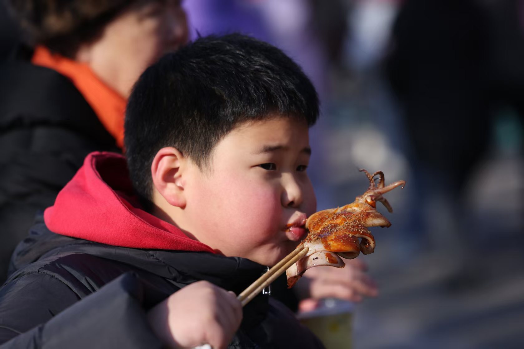 1月29日,龙潭庙会上,小朋友在大快朵颐。