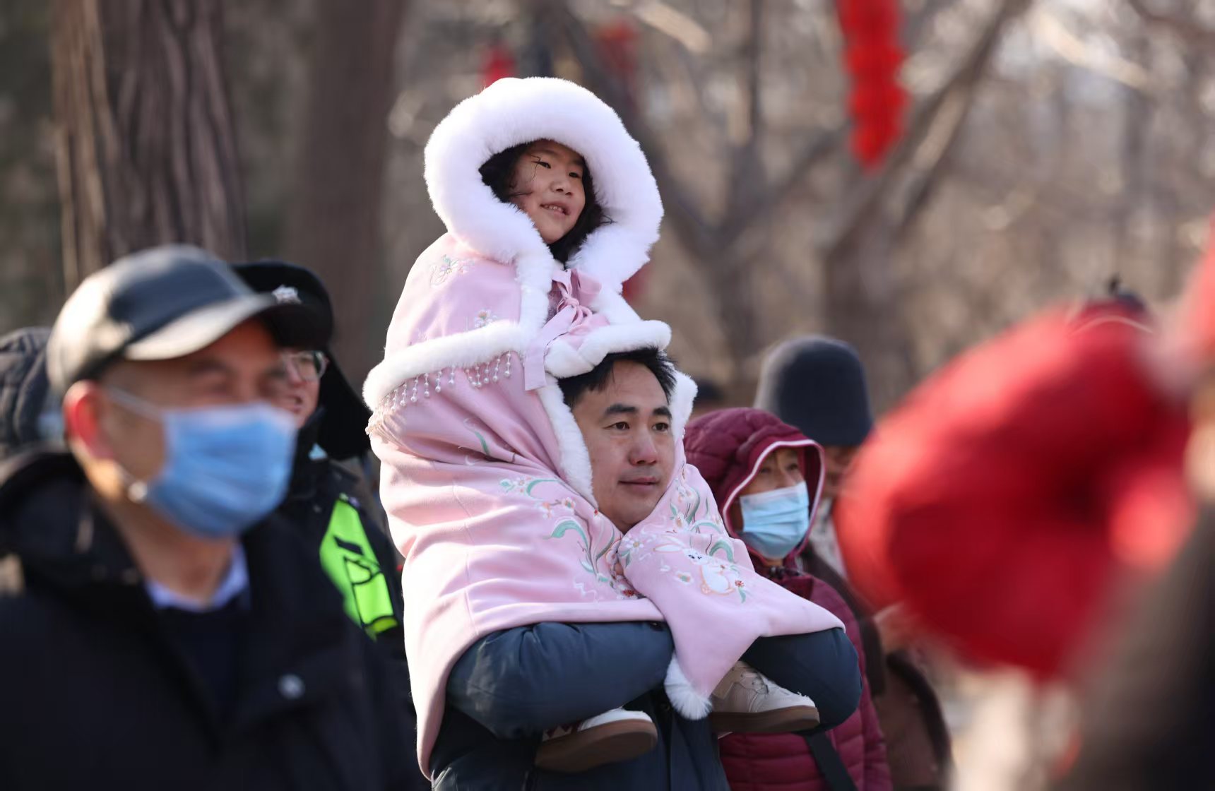 1月29日,龙潭庙会上,气温较低,小朋友坐在家长的肩膀上观看节目。