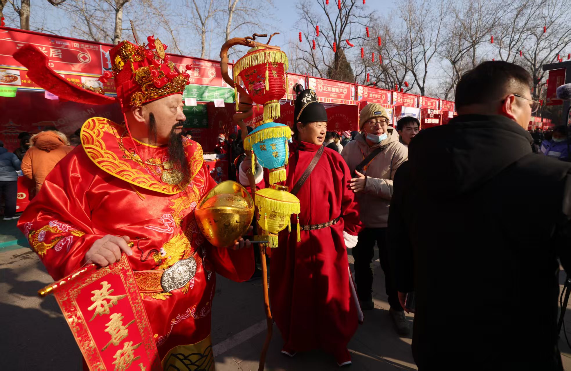 1月29日,龙潭庙会上,游客身穿财神服装逛庙会。