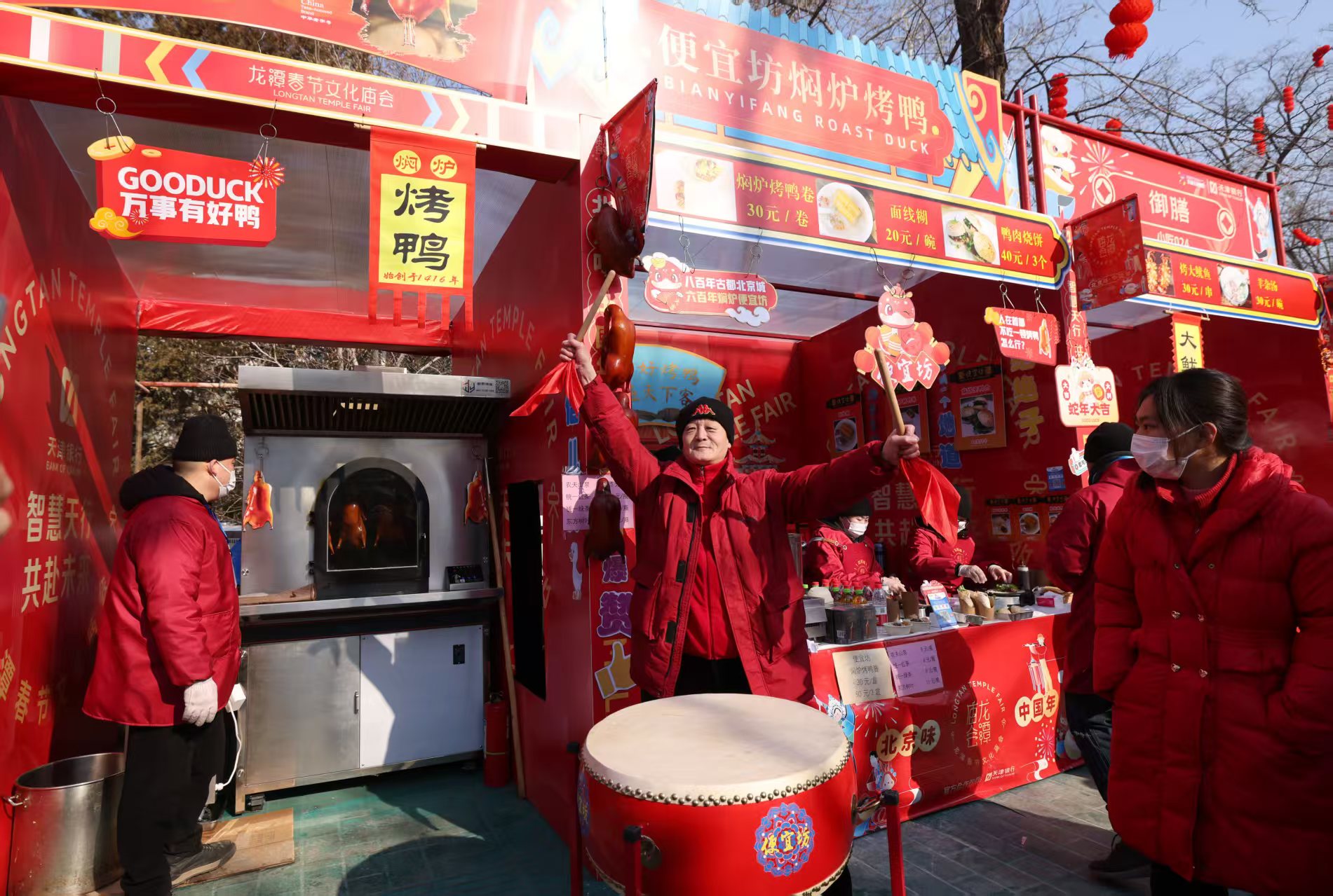 在今年龙潭庙会特色小食摊摊位上,便宜坊的焖炉烤鸭、紫光园的奶皮子酸奶、天兴居的炒肝卤煮、一条龙的羊肉串、都一处的烧卖等美味同时亮相。便宜坊首次把烤鸭炉放置在了庙会现场,现烤现片现卷,游客可以一边敲大鼓一边品尝新鲜出炉、热气腾腾的焖炉烤鸭。