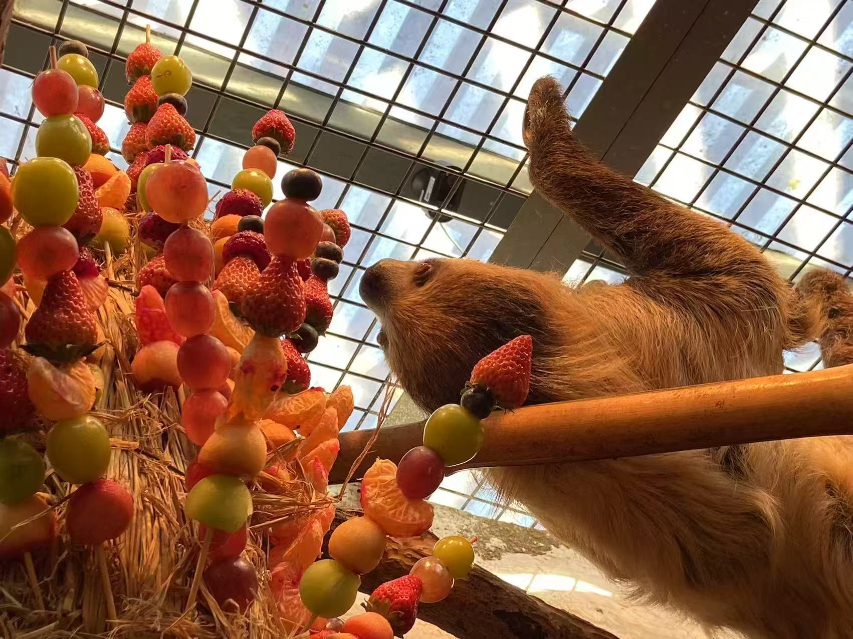 北京动物园,二趾树懒享用水果串成的“糖葫芦”。北京动物园供图